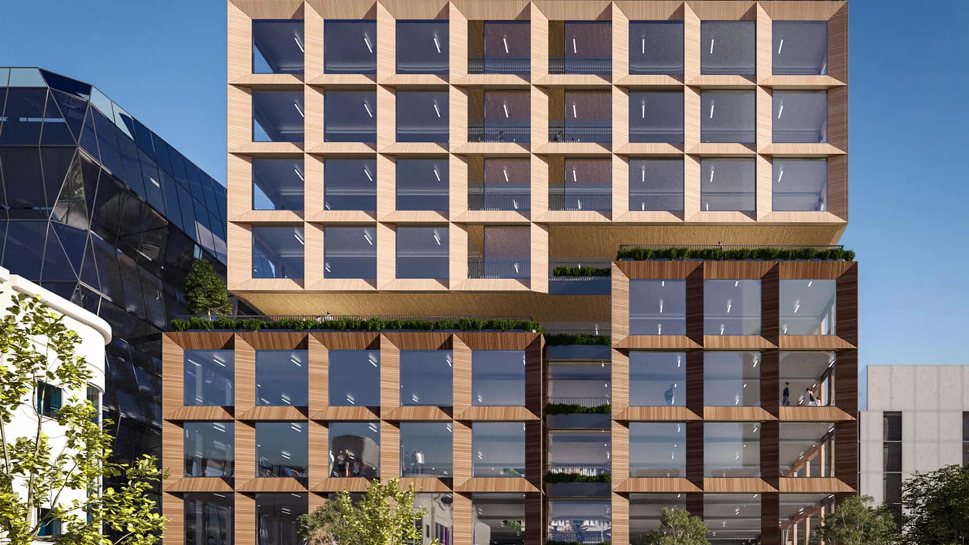 Key features include resort-style end-of-trip facilities, on-floor winter gardens, expansive terraces throughout the building—including a striking rooftop garden—and multiple third-space or mixed-use areas."