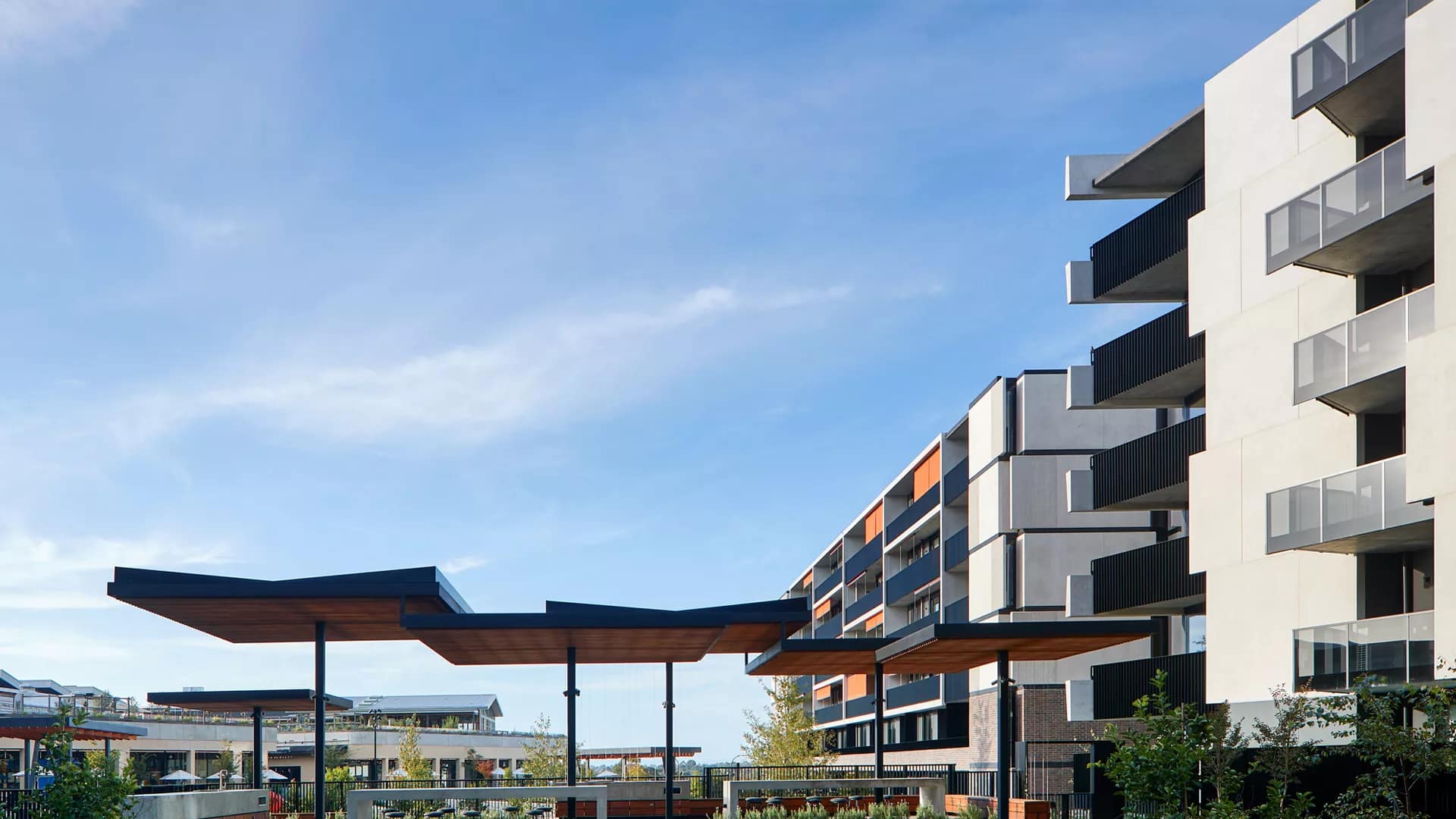 Crafted from curved and textured precast concrete, these structures are surrounded by expansive garden spaces at the ground level, establishing this project as the largest within the Burwood estate.